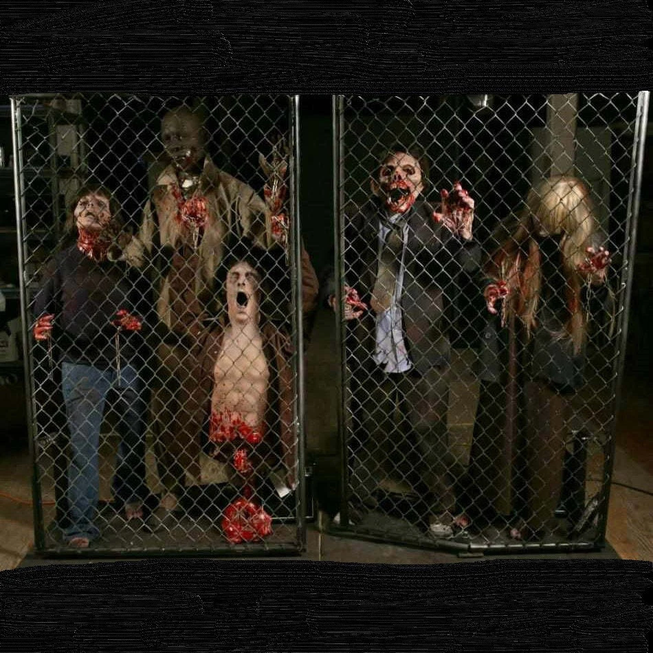 This Zombie shock includes both the Zombie Outbreak and Zombie Breakout. Just when you think the zombies are safe behind the fence one breaks out for an unforgettable scare! Includes 3 animated zombies, one static zombie, 2 animated moving fences, a zombie costume, plus sound and lights. The costumed zombie is the one that breaks out! AC power and air compressor are needed. Use this zombie scare as part of your haunted house or Halloween attraction and have fun watching you guests scream and laugh as the zombies scare them!