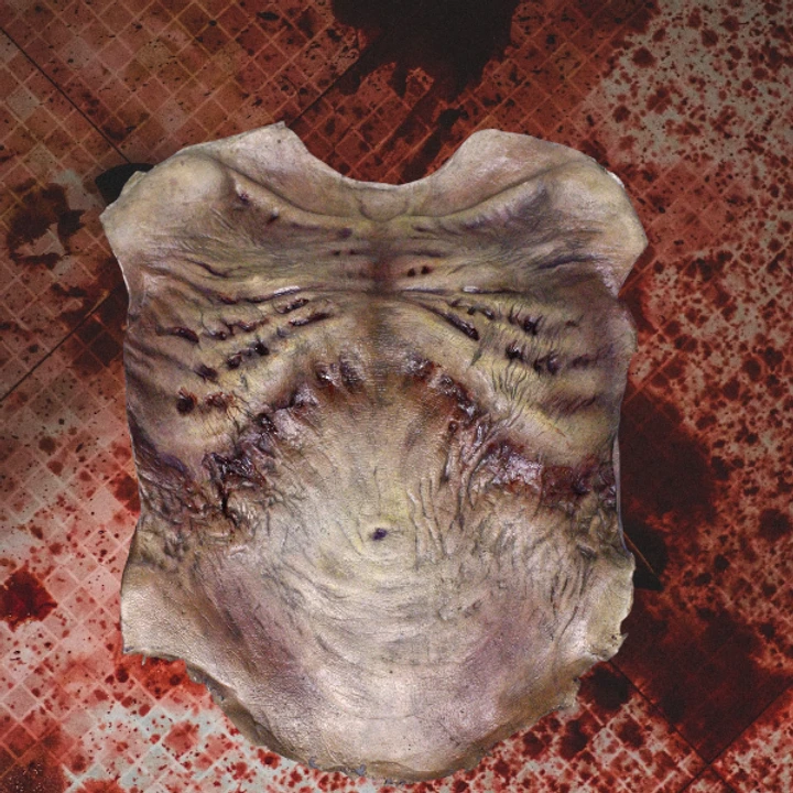 lifesize zombie torso skin showing the ribs and decayed skin. Cast in poly foam rubber.